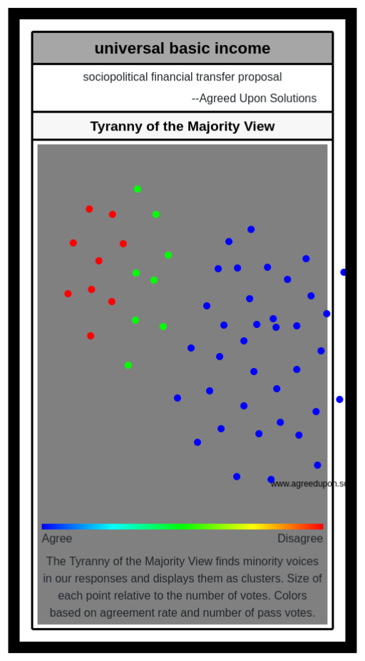 The Tyranny of the Majority View finds minority voices in our responses and displays them as clusters. Size of each point relative to the number of votes. Colors based on agreement rate and number of pass votes.