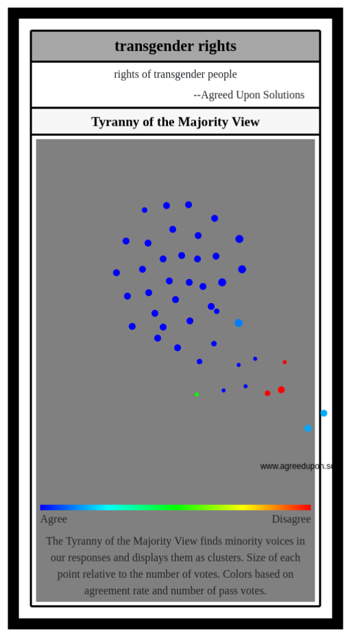The Tyranny of the Majority View finds minority voices in our responses and displays them as clusters. Size of each point relative to the number of votes. Colors based on agreement rate and number of pass votes.