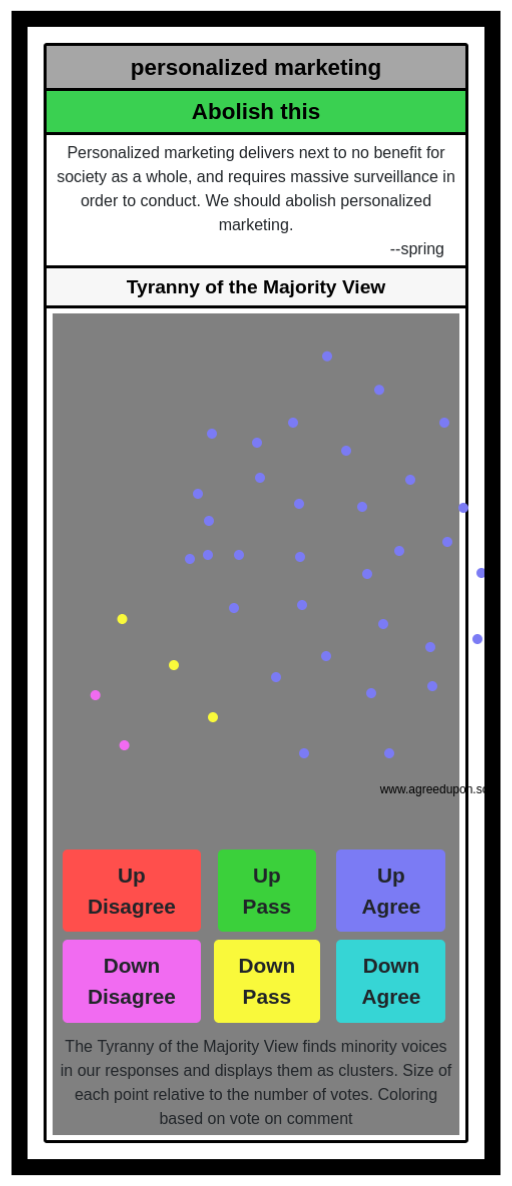 The Tyranny of the Majority View finds minority voices in our responses and displays them as clusters. Size of each point relative to the number of votes. Coloring based on vote on comment