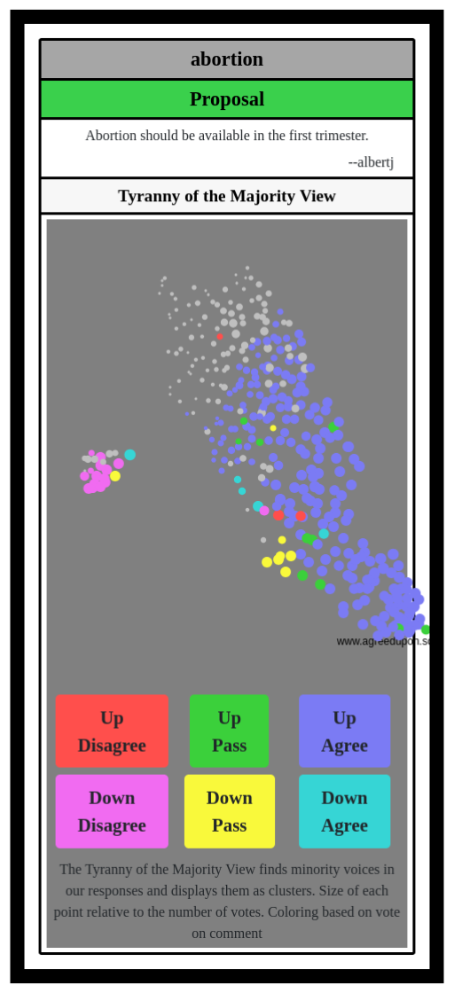 The Tyranny of the Majority View finds minority voices in our responses and displays them as clusters. Size of each point relative to the number of votes. Coloring based on vote on comment
