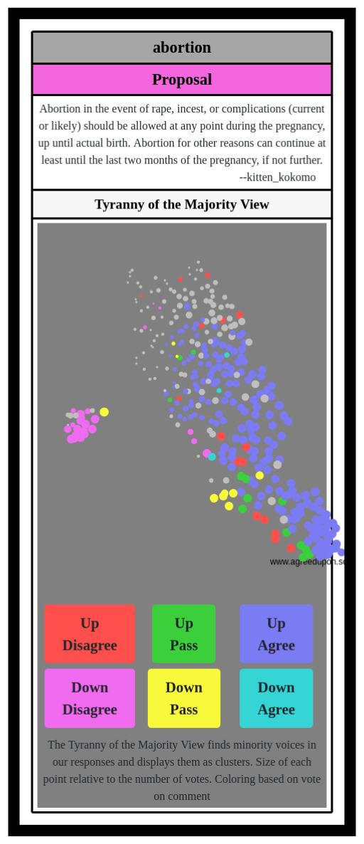The Tyranny of the Majority View finds minority voices in our responses and displays them as clusters. Size of each point relative to the number of votes. Coloring based on vote on comment