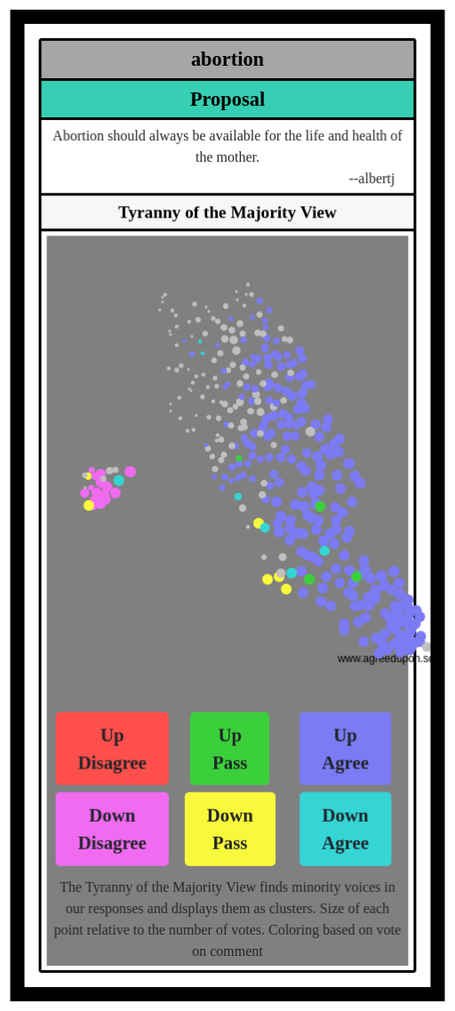 The Tyranny of the Majority View finds minority voices in our responses and displays them as clusters. Size of each point relative to the number of votes. Coloring based on vote on comment