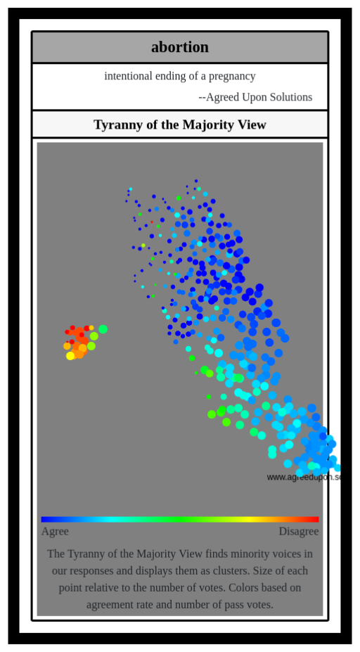 The Tyranny of the Majority View finds minority voices in our responses and displays them as clusters. Size of each point relative to the number of votes. Colors based on agreement rate and number of pass votes.