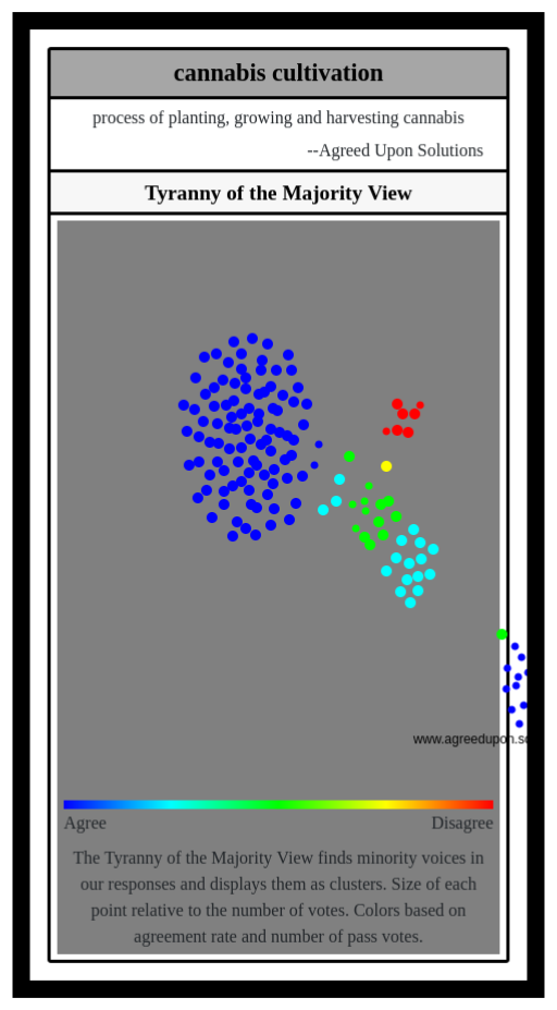 The Tyranny of the Majority View finds minority voices in our responses and displays them as clusters. Size of each point relative to the number of votes. Colors based on agreement rate and number of pass votes.