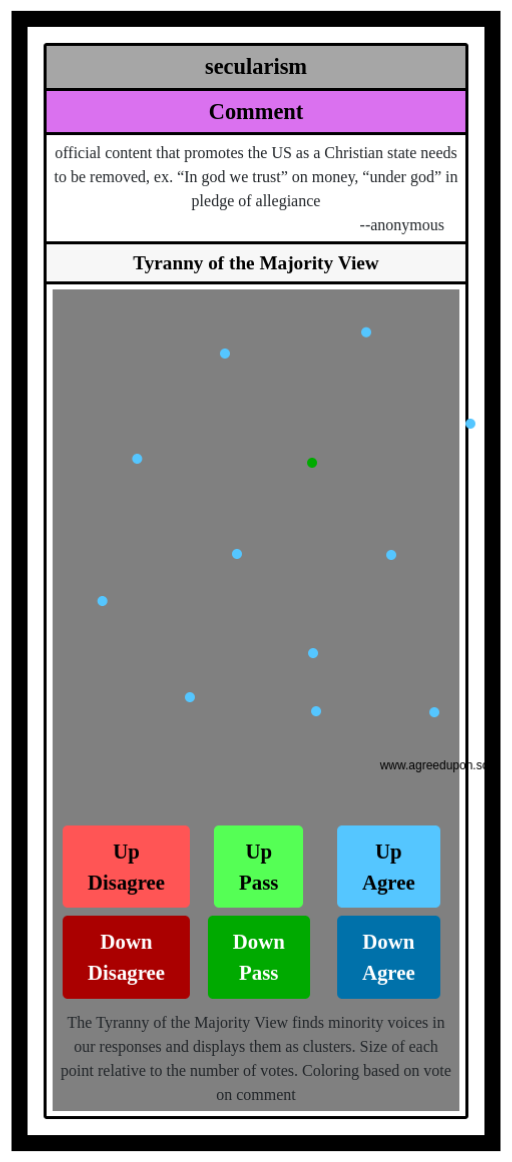 The Tyranny of the Majority View finds minority voices in our responses and displays them as clusters. Size of each point relative to the number of votes. Coloring based on vote on comment