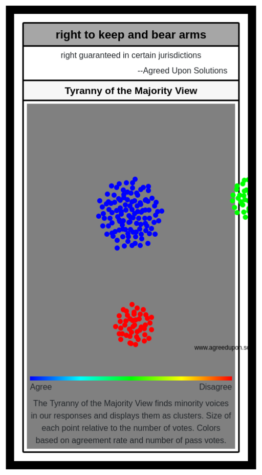 The Tyranny of the Majority View finds minority voices in our responses and displays them as clusters. Size of each point relative to the number of votes. Colors based on agreement rate and number of pass votes.