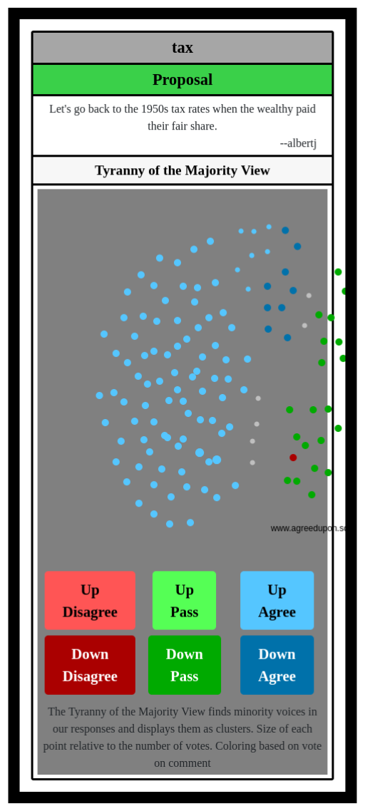 The Tyranny of the Majority View finds minority voices in our responses and displays them as clusters. Size of each point relative to the number of votes. Coloring based on vote on comment