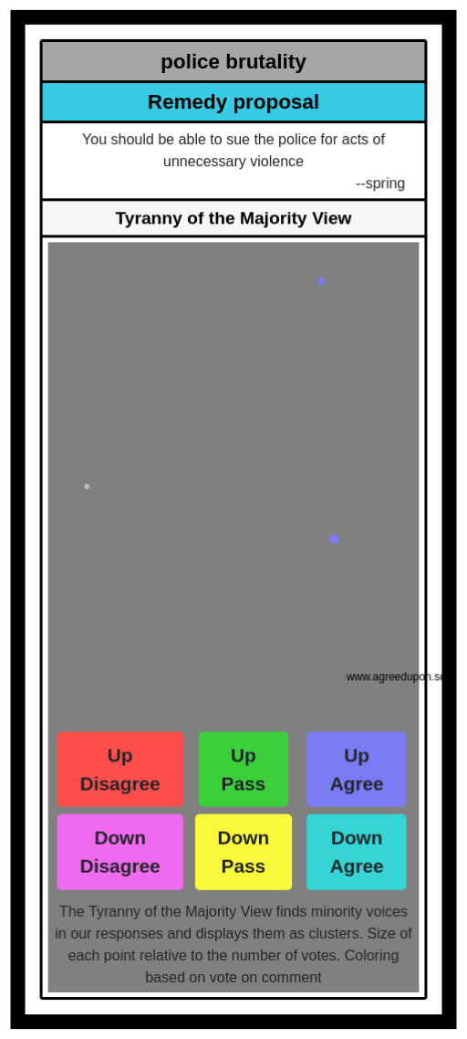 The Tyranny of the Majority View finds minority voices in our responses and displays them as clusters. Size of each point relative to the number of votes. Coloring based on vote on comment