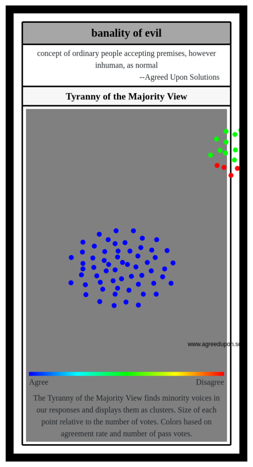 The Tyranny of the Majority View finds minority voices in our responses and displays them as clusters. Size of each point relative to the number of votes. Colors based on agreement rate and number of pass votes.