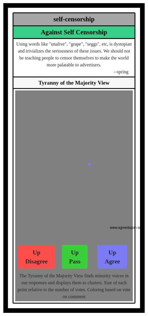 The Tyranny of the Majority View finds minority voices in our responses and displays them as clusters. Size of each point relative to the number of votes. Coloring based on vote on comment