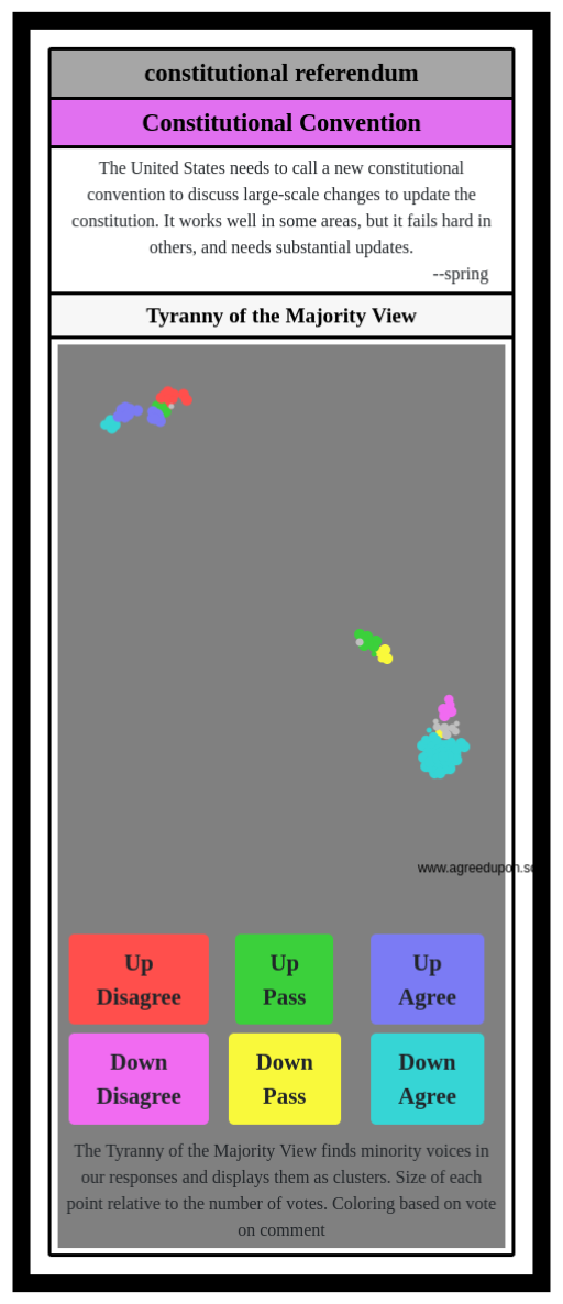 The Tyranny of the Majority View finds minority voices in our responses and displays them as clusters. Size of each point relative to the number of votes. Coloring based on vote on comment