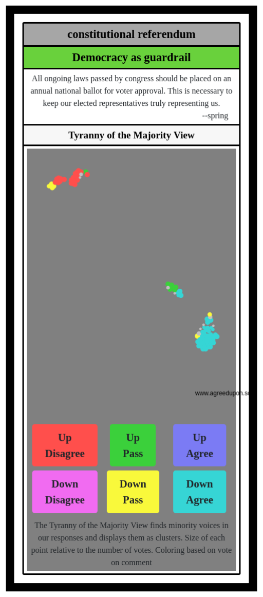 The Tyranny of the Majority View finds minority voices in our responses and displays them as clusters. Size of each point relative to the number of votes. Coloring based on vote on comment