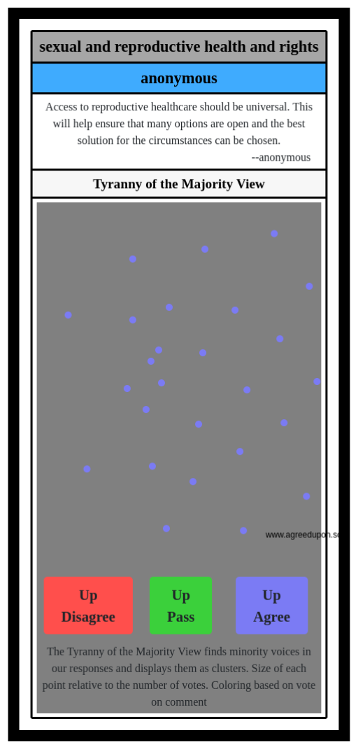 The Tyranny of the Majority View finds minority voices in our responses and displays them as clusters. Size of each point relative to the number of votes. Coloring based on vote on comment