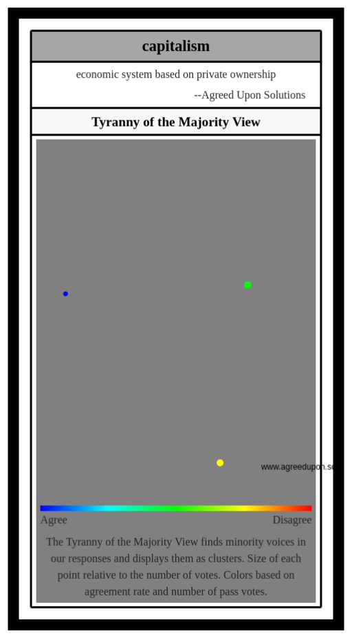 The Tyranny of the Majority View finds minority voices in our responses and displays them as clusters. Size of each point relative to the number of votes. Colors based on agreement rate and number of pass votes.