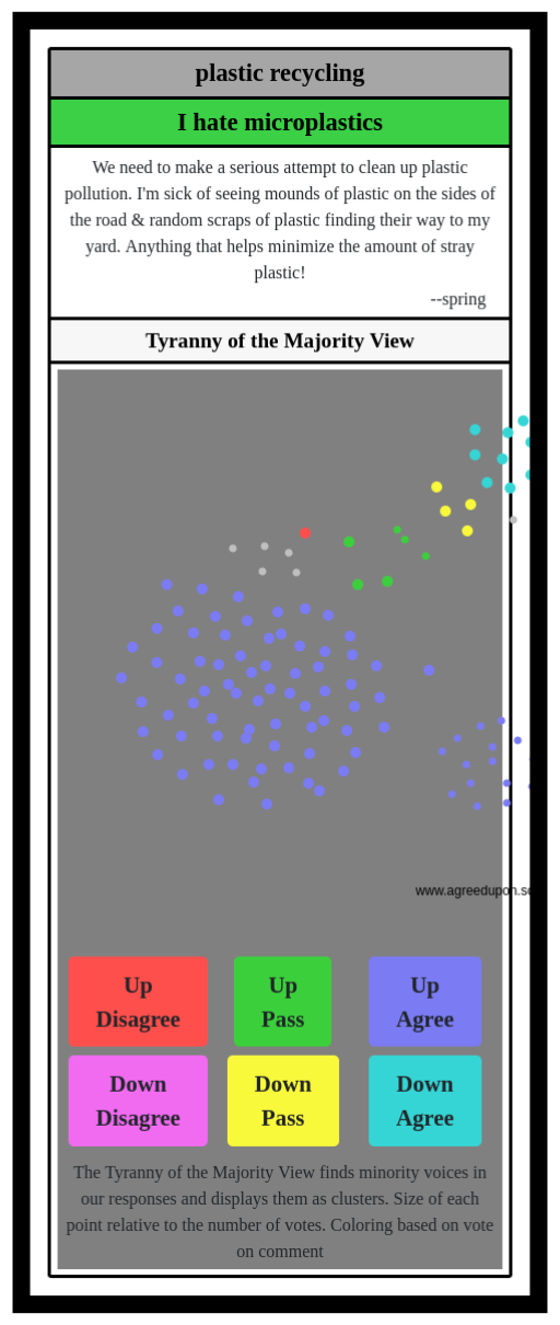 The Tyranny of the Majority View finds minority voices in our responses and displays them as clusters. Size of each point relative to the number of votes. Coloring based on vote on comment