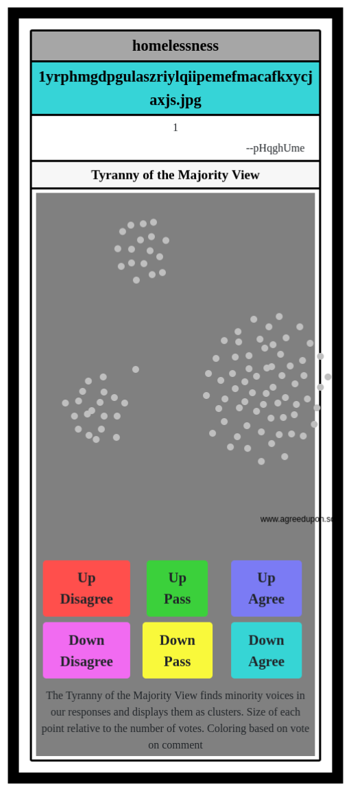 The Tyranny of the Majority View finds minority voices in our responses and displays them as clusters. Size of each point relative to the number of votes. Coloring based on vote on comment