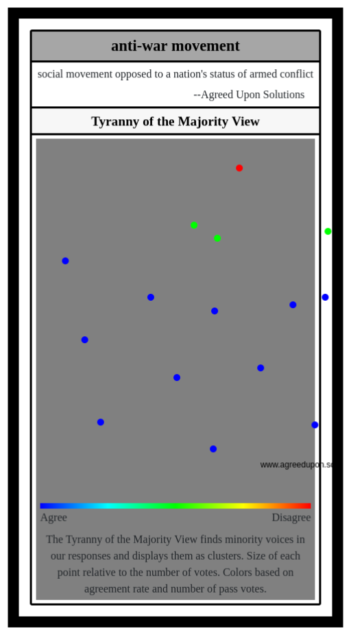 The Tyranny of the Majority View finds minority voices in our responses and displays them as clusters. Size of each point relative to the number of votes. Colors based on agreement rate and number of pass votes.