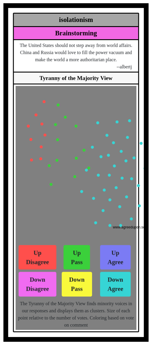 The Tyranny of the Majority View finds minority voices in our responses and displays them as clusters. Size of each point relative to the number of votes. Coloring based on vote on comment