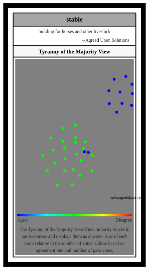 The Tyranny of the Majority View finds minority voices in our responses and displays them as clusters. Size of each point relative to the number of votes. Colors based on agreement rate and number of pass votes.