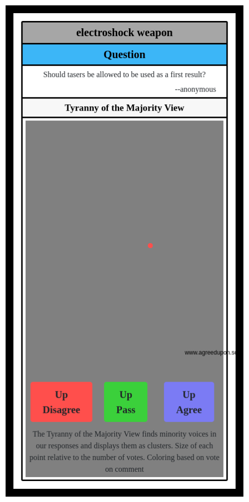 The Tyranny of the Majority View finds minority voices in our responses and displays them as clusters. Size of each point relative to the number of votes. Coloring based on vote on comment