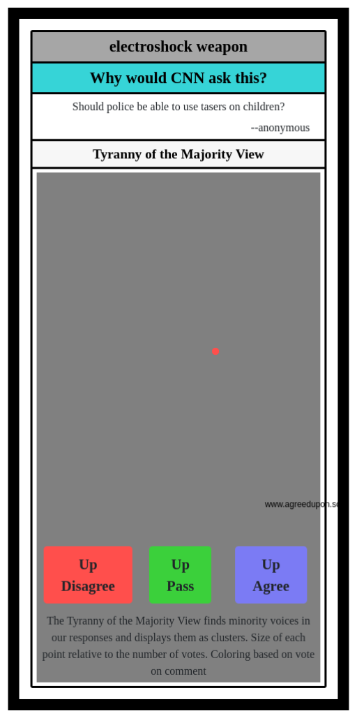 The Tyranny of the Majority View finds minority voices in our responses and displays them as clusters. Size of each point relative to the number of votes. Coloring based on vote on comment