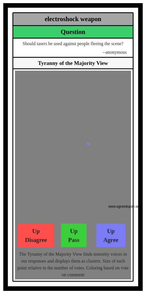 The Tyranny of the Majority View finds minority voices in our responses and displays them as clusters. Size of each point relative to the number of votes. Coloring based on vote on comment