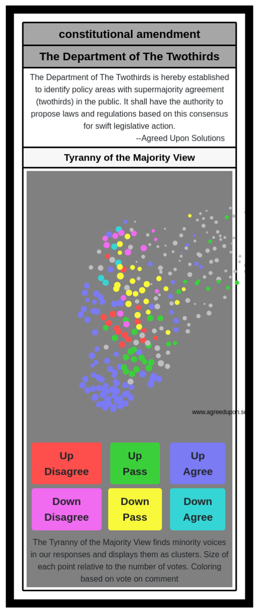 The Department of The Twothirds is hereby established to identify policy areas with supermajority agreement (twothirds) in the public. It shall have the authority to propose laws and regulations based on this consensus for swift legislative action.