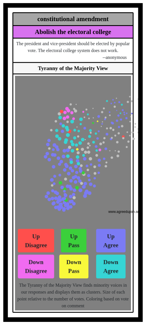 The Tyranny of the Majority View finds minority voices in our responses and displays them as clusters. Size of each point relative to the number of votes. Coloring based on vote on comment