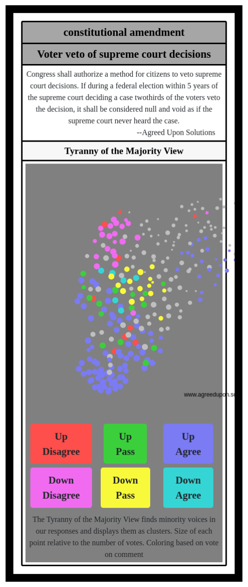 Congress shall authorize a method for citizens to veto supreme court decisions. If during a federal election within 5 years of the supreme court deciding a case twothirds of the voters veto the decision, it shall be considered null and void as if the supreme court never heard the case.
