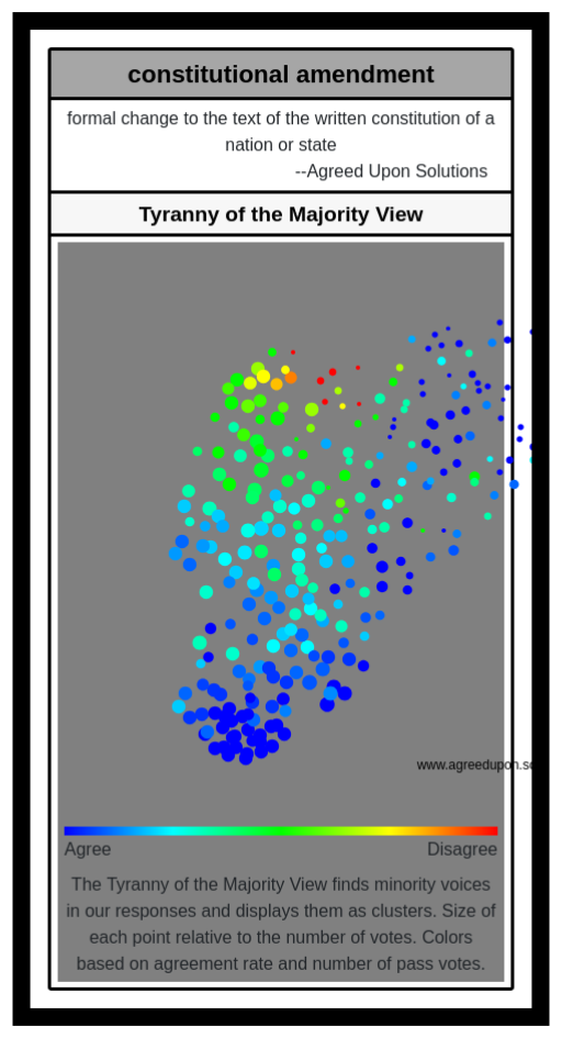 The Tyranny of the Majority View finds minority voices in our responses and displays them as clusters. Size of each point relative to the number of votes. Colors based on agreement rate and number of pass votes.