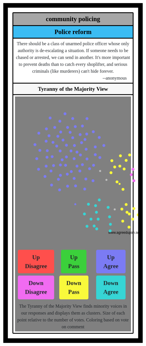 The Tyranny of the Majority View finds minority voices in our responses and displays them as clusters. Size of each point relative to the number of votes. Coloring based on vote on comment