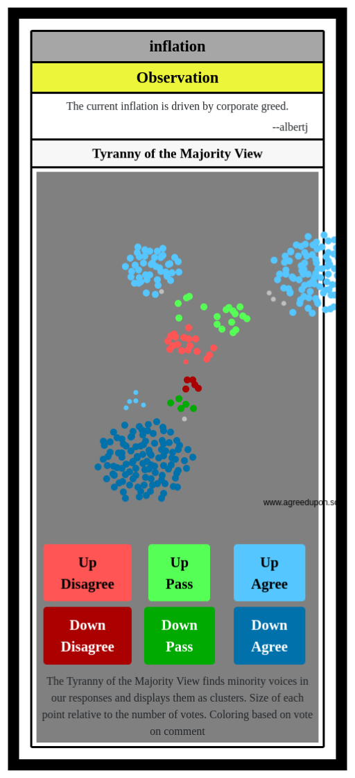 The Tyranny of the Majority View finds minority voices in our responses and displays them as clusters. Size of each point relative to the number of votes. Coloring based on vote on comment