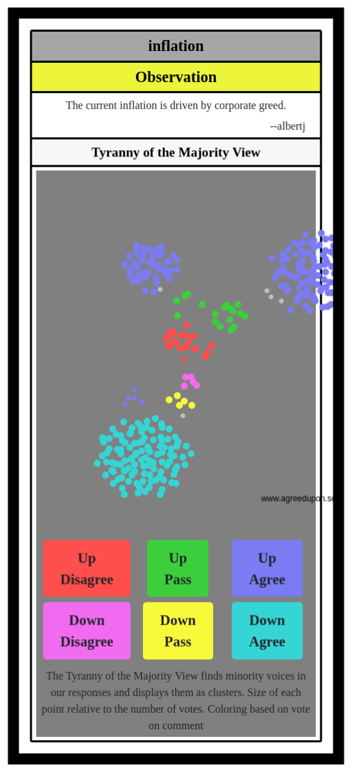 The Tyranny of the Majority View finds minority voices in our responses and displays them as clusters. Size of each point relative to the number of votes. Coloring based on vote on comment