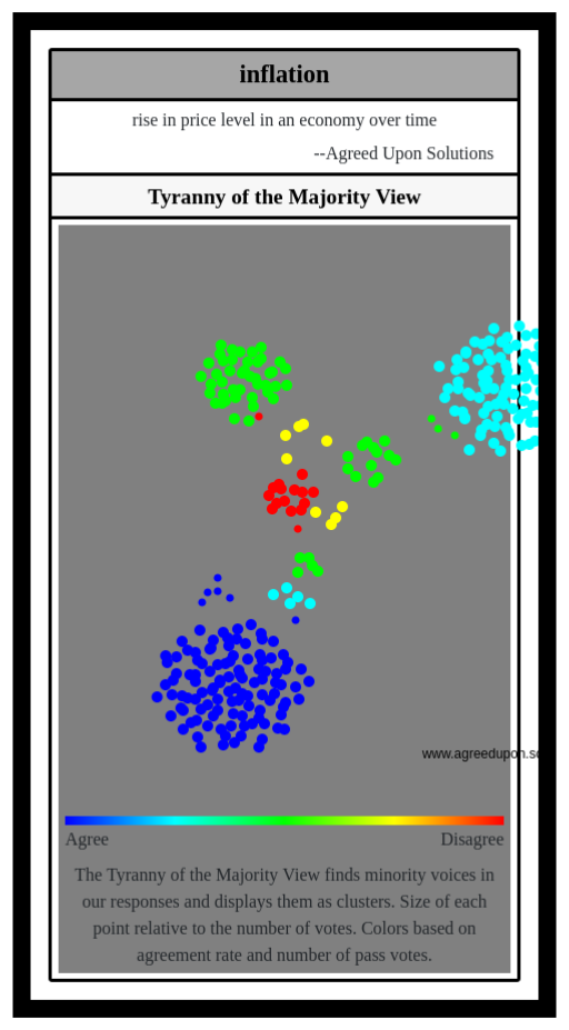 The Tyranny of the Majority View finds minority voices in our responses and displays them as clusters. Size of each point relative to the number of votes. Colors based on agreement rate and number of pass votes.