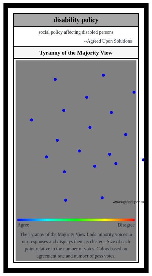 The Tyranny of the Majority View finds minority voices in our responses and displays them as clusters. Size of each point relative to the number of votes. Colors based on agreement rate and number of pass votes.