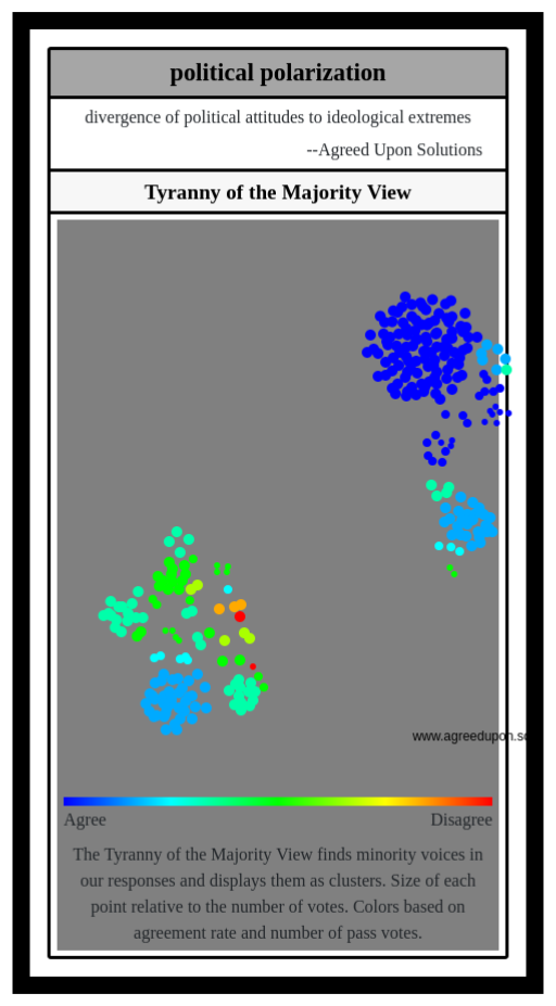 The Tyranny of the Majority View finds minority voices in our responses and displays them as clusters. Size of each point relative to the number of votes. Colors based on agreement rate and number of pass votes.