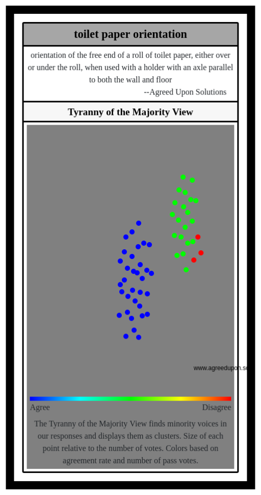 The Tyranny of the Majority View finds minority voices in our responses and displays them as clusters. Size of each point relative to the number of votes. Colors based on agreement rate and number of pass votes.
