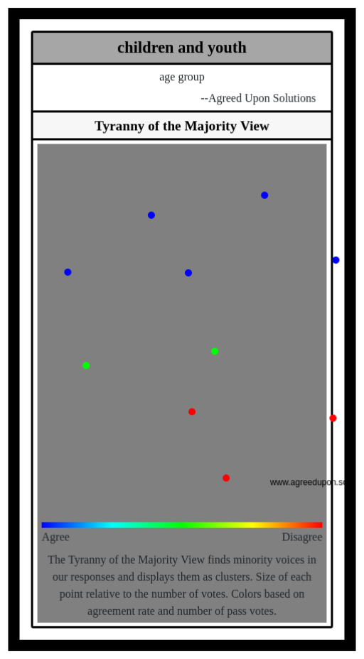 The Tyranny of the Majority View finds minority voices in our responses and displays them as clusters. Size of each point relative to the number of votes. Colors based on agreement rate and number of pass votes.