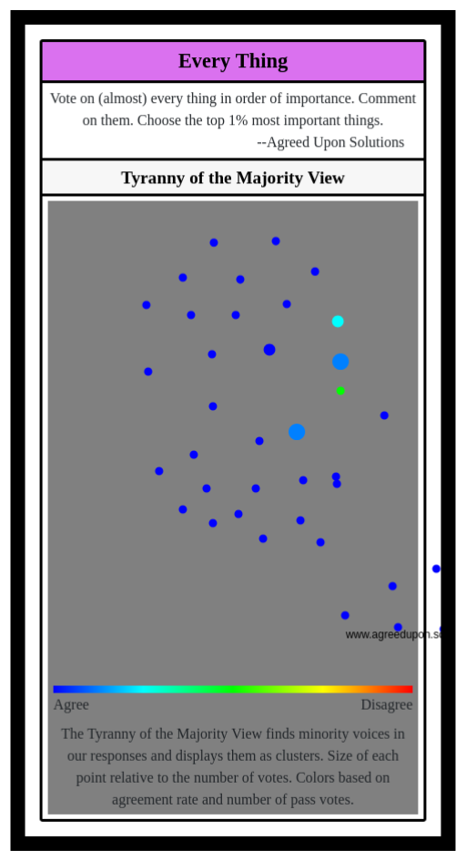 The Tyranny of the Majority View finds minority voices in our responses and displays them as clusters. Size of each point relative to the number of votes. Colors based on agreement rate and number of pass votes.