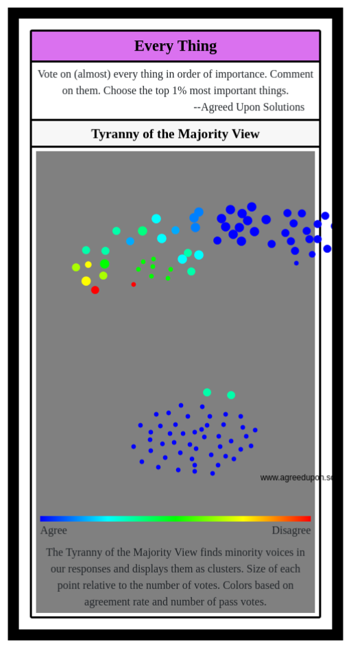 The Tyranny of the Majority View finds minority voices in our responses and displays them as clusters. Size of each point relative to the number of votes. Colors based on agreement rate and number of pass votes.